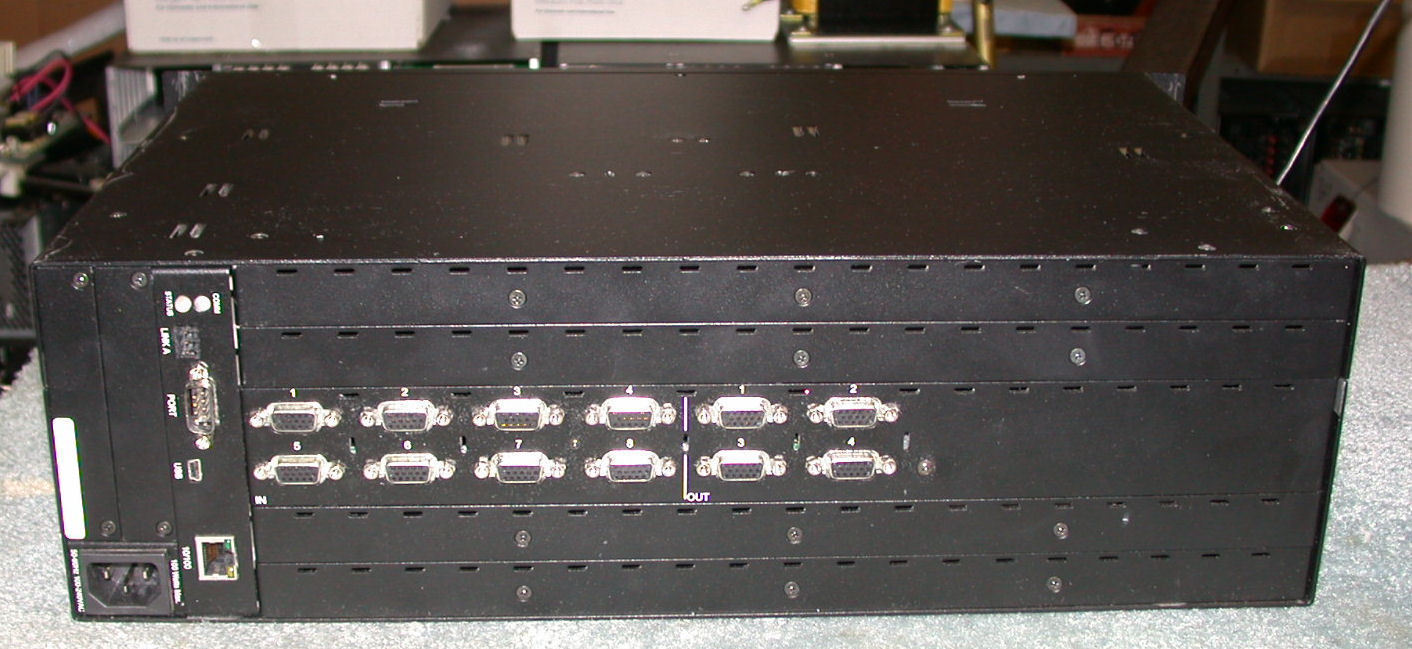 | High-End Low Cost 8x4 VGA/RGBHV Matrix Switch Introducing our new line of "Scratch & Dent" low cost Optima matrix switchers.  Actual Picture of item We made a special purchase on these AMX/Autopatch Optima switchers with unique configurations. They have cosmetic blemishes but that does not effect the operation of the unit in any way. Now is your chance to save thousands! Need a different configuration, CLICK HERE!!! What Exactly is this? This is a TRUE 8x4 VGA Matrix Switcher/Router which means that you can connect 8 VGA sources (Computer, video, etc) and 4 VGA Destinations (Projectors, Displays, Recorders, etc). Via the magic in the box ANY SOURCE can be electronically switched to ANY DESTINATION without any manual wiring or patching. You may have seen these on eBay before and there may be some up for bid right now but there are several things that make ours special. First off, see our feedback- We don't leave our buyers unhappy, Second, we have electronic engineers and technicians on staff that have refurbished and re-certified every aspect of these units to 100% perfect, this includes rebuilding fans and power supplies allowing us to provide a full 6 month warranty. Also included is an RS232 Cable and Software for a standard pc to control it + Full Manuals in PDF. A Word About VGA & RGBHV This is a RGBHV (Red, Green, Blue, Horizontal & Vertical) analog switcher often called VGA because PC computer monitors adopted the RGBHV signal set and the first monitors that used it were called VGA monitors. Simply stated this switcher will pass five signals, 3 of them are standard video channels (RGB) and two of them are optimized for digital sync signals and can be used for digital audio if needed. Using VGA to BNC breakout cables this switcher can be used for HDTV & Digital Audio. Controlling your system We include software and cables to allow to control this unit from a Windows PC. The system accepts RS232 serial commands and has optional easy to use front panels for manual switching (please see options below). We also have in development a low cost IR receiver and remote control option coming soon. Why buy from Us First off unlike most sellers on Ebay, we are not selling equipment with the "I know nothing" disclaimer. We have Re-certified this unit and will stand behind it 100% just like the factory would if you bought a new one, should you have any issues we have more slide-in replacement modules and/or whole units which we will gladly exchange. We can also help with initial system installation and have many more tested and approved widgets selected to make your system grow more easily, If you want to grow a large system then buy this Switcher and consider our help a fringe benefit of the sale or "Value Added" as some would say. See our website for more info "https://www.sportsbar-tv.com/reswitch/". Upgrades & Warranties We warranty our units for 6 full months and pay all shipping both directions, after that we offer discount service for life (not likely needed). Lastly we provide support before, during and after the installation including help designing your system for no extra cost! 100% Satisfaction is Guaranteed. Also in the event you need another system down the road Reswitch.com will credit the full amount you paid for this switcher toward a larger one within two years from the date of purchase. *Scratch & Dent policy: These items are refurbished. In order to keep this as low cost as possible there WILL be scratches and possibly even dents on the face plate. Should you require a pristine, cosmetically new looking unit please contact us before purchase to insure availability and cost. This auction is guaranteed as described otherwise it is an AS-IS auction with buyer to pay all shipping. We post accurate images of all our auctions so please go over them by clicking each picture to get an expanded view so you can make sure you are getting exactly what you need.  |