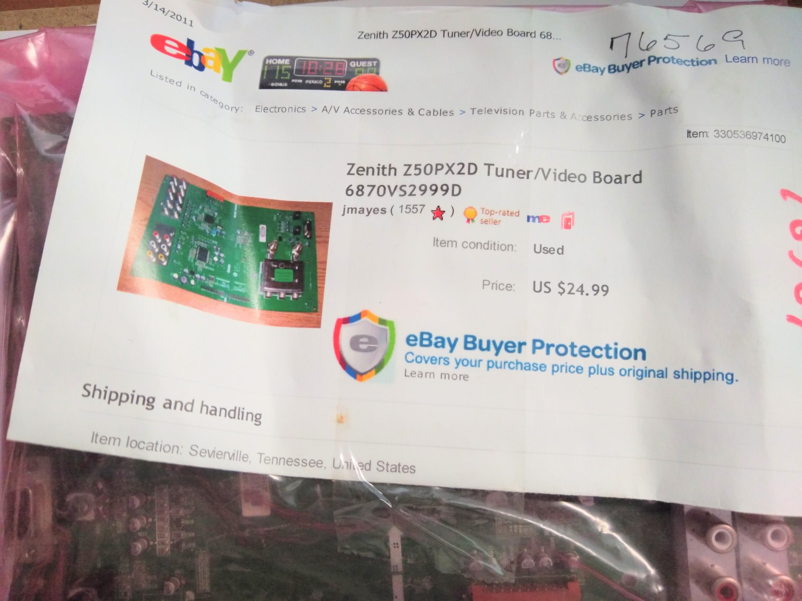 Zenith Z50PX2D Tuner/Video Board 6870VS2999D